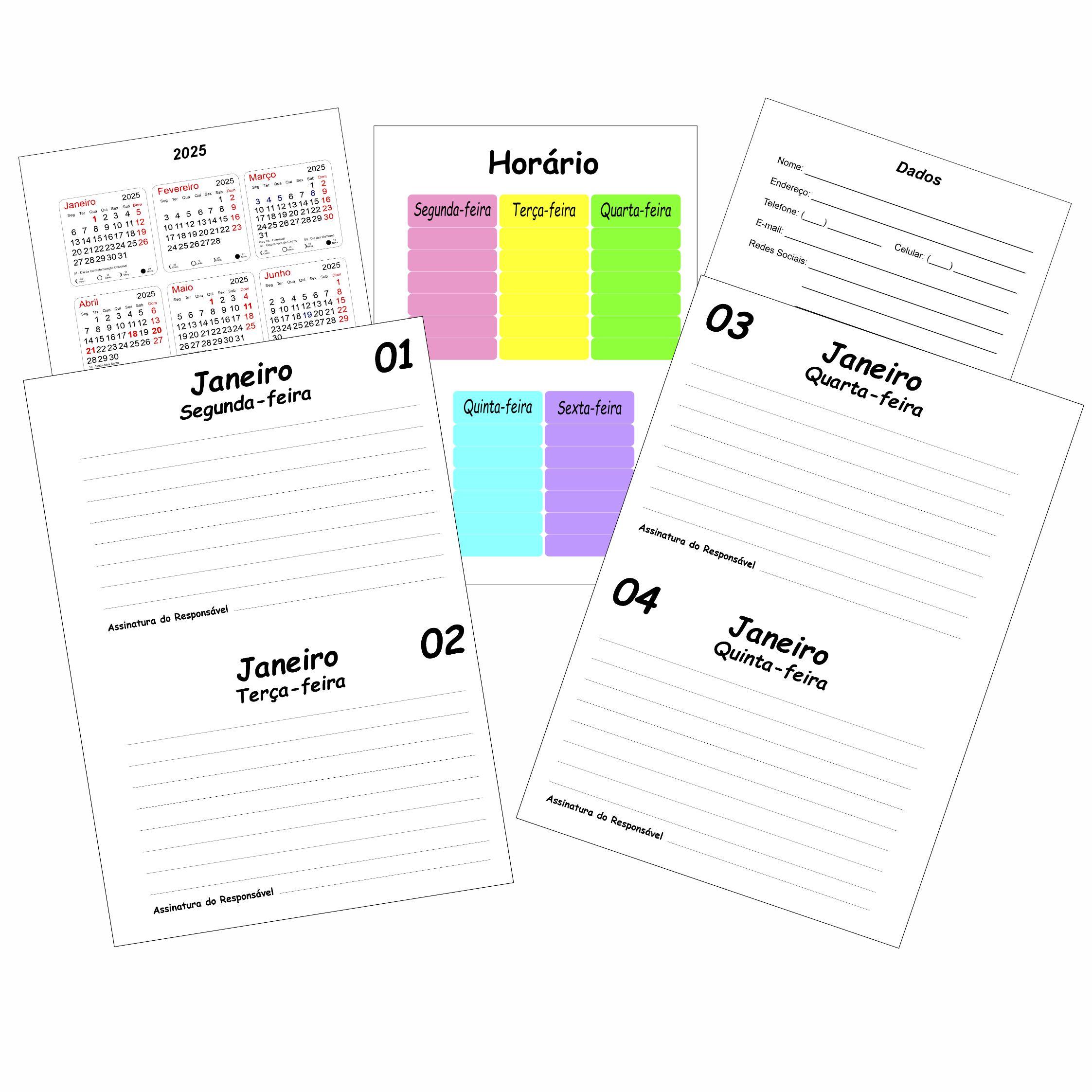 Espaços para dados de emergência, horários de aulas, atividades extracurriculares, controlo de tarefas e dois dias por pagina(segunda a sexta).
