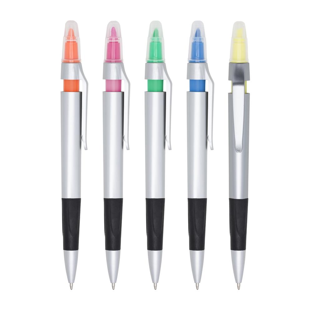 Nossa Caneta Plástica Marca Texto une a escrita clássica com a funcionalidade do destaque em um único item. Com um detalhe emborrachado que garante muito mais conforto na pegada, ela possui acionamento por clique para a caneta azul 1.0mm e uma tampa protetora para o marca-texto, mantendo a tinta sempre fresca. É o brinde perfeito para estudantes e profissionais que buscam otimizar o espaço no estojo com muito estilo e eficiência!