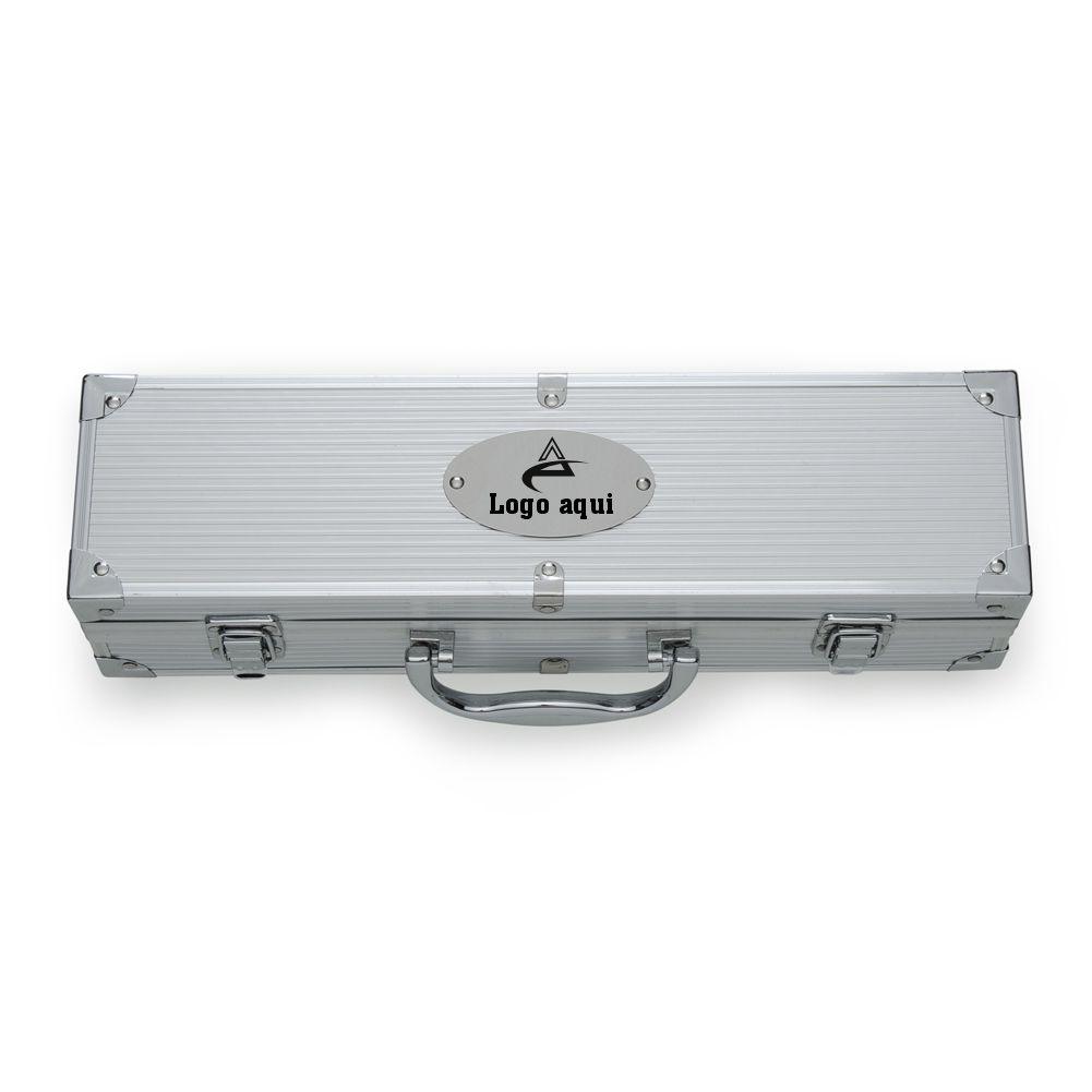 01 faca de corte: (32,5 cm x 2,5 cm), 01 garfo trinchante (35 cm x 3 cm), 01 pegador de carnes (35 cm x 4,1 cm) e 01 maleta de alumínio com placa de personalização.