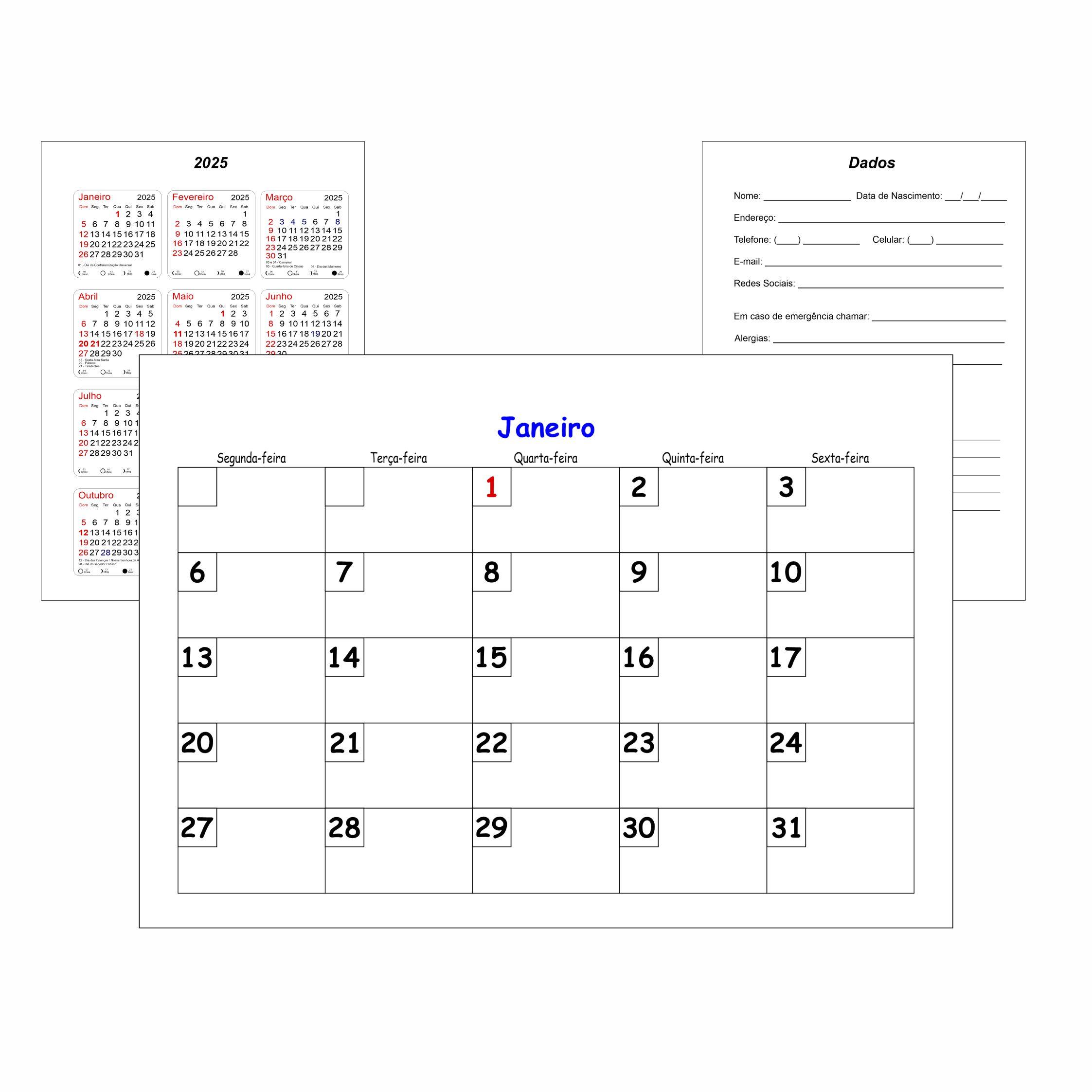 Nosso Planner de Dias Úteis foi desenvolvido especialmente para profissionais que precisam de foco total na produtividade de segunda a sexta-feira. Com layout estratégico e o acabamento sofisticado do espiral de metal, a exclusividade da personalização na capa dura reforça a qualidade e o profissionalismo da sua rotina. É a ferramenta ideal para organizar metas e prazos com eficiência e elegância.