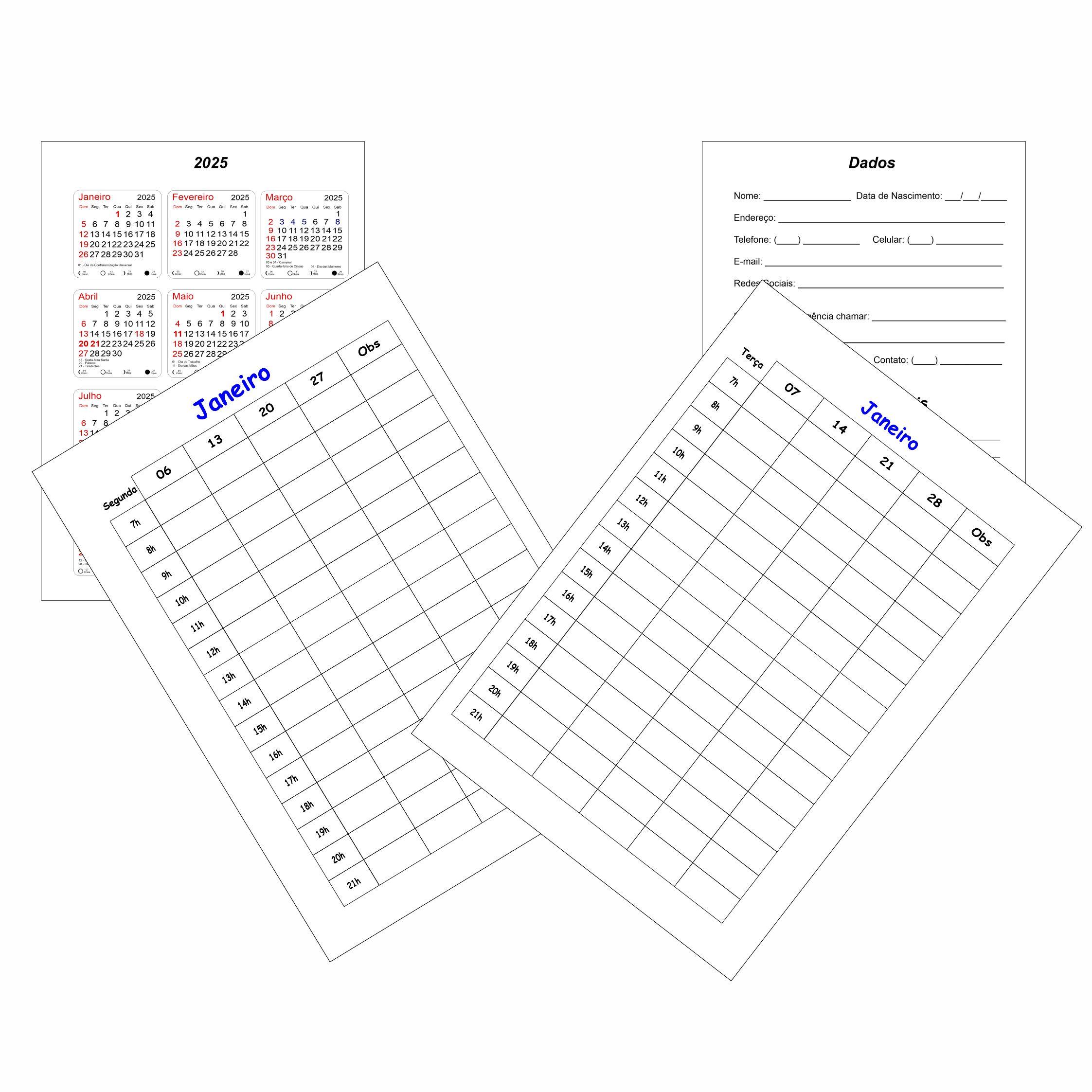 Nosso Planner Semanal com Horários une a praticidade da visão vertical com a precisão necessária para o seu dia a dia. Com ele, você consegue visualizar todos os seus compromissos de um mesmo dia da semana ao longo de todo o mês, tudo organizado hora a hora. A exclusividade da personalização na capa dura, somada ao acabamento premium em espiral de metal, reforça a qualidade e o profissionalismo da sua rotina, sendo a ferramenta perfeita para quem busca controle total do tempo com elegância.